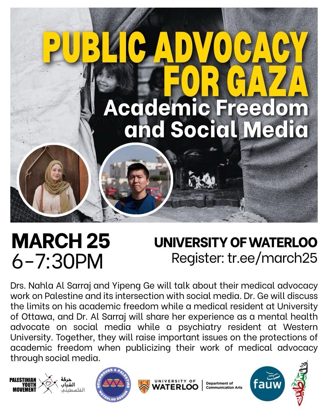 Drs. Nahla Al Sarraj and Yipeng Ge will talk about their medical advocacy work on Palestine and its intersection with social media. Dr. Ge will discuss the limits on his academic freedom while a medical resident at University of Ottawa, and Dr. al Sarraj will share her experience as a mental health advocate on social media while a psychiatry resident at Western University. Together, they will raise important issues on the protections of academic freedom when publicizing their work of medical advocacy through social media.